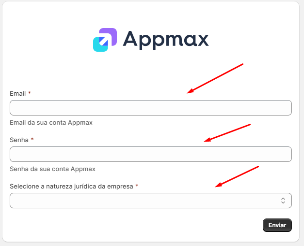 Em seguida, você deve inserir o e-mail utilizado para acessar a Appmax, e selecionar a natureza jurídica de sua empresa, e depois informar o tipo de documento solicitado para finalizar o processo de instalação. Após isso, deverá clicar na opção “Configurar Aplicativo” para ativar o provedor de pagamentos.