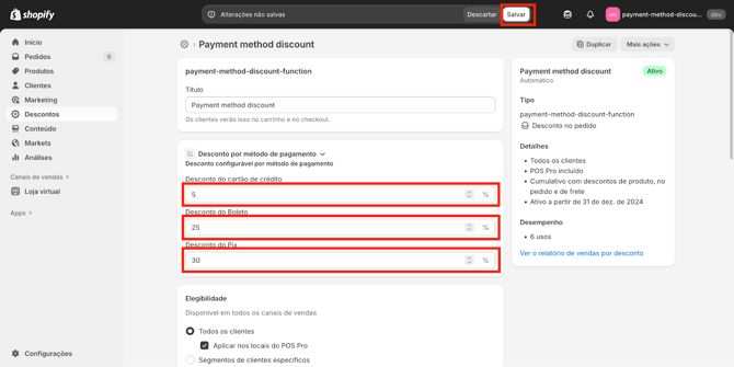 Saiba como configurar descontos para pagamentos na integração Shopify.