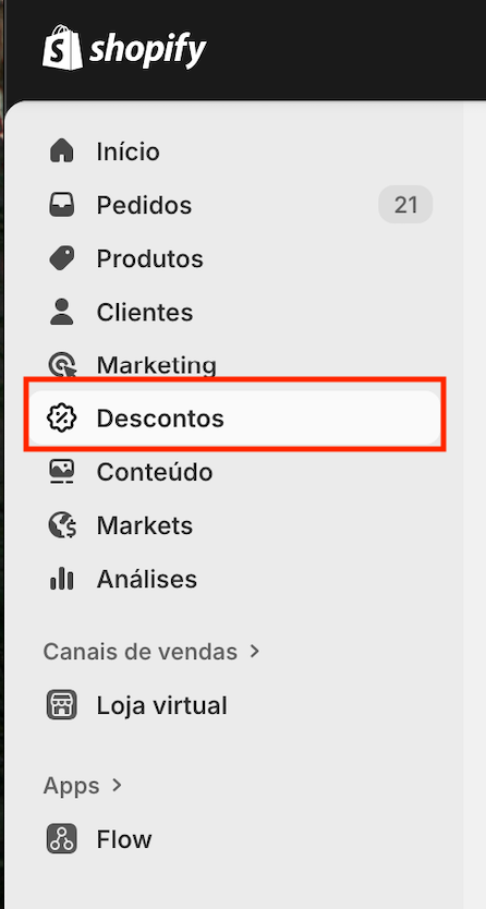 Para configurar descontos para a forma de pagamento em sua loja, você precisa acessar a seção de descontos no painel de administração do Shopify: